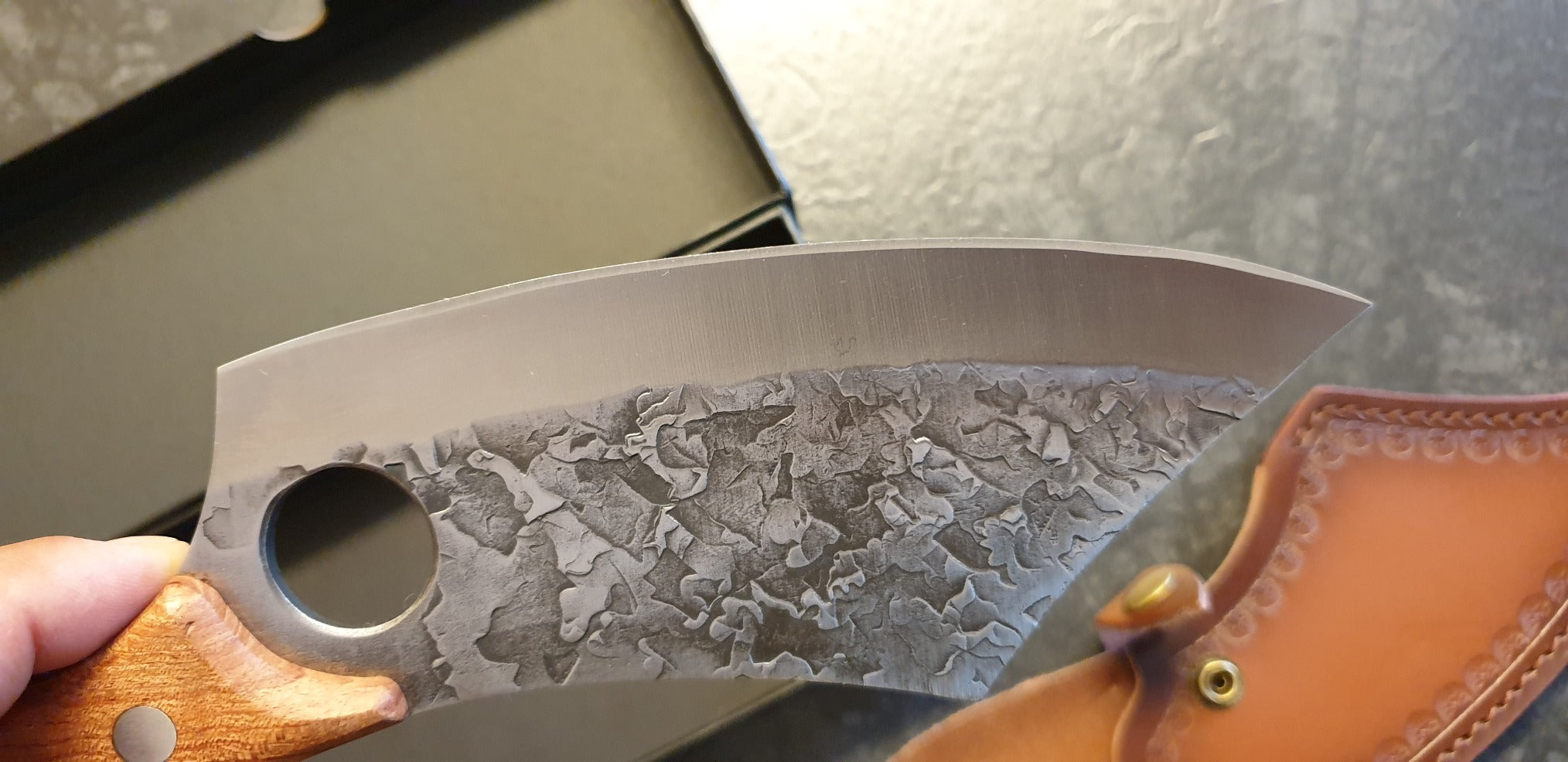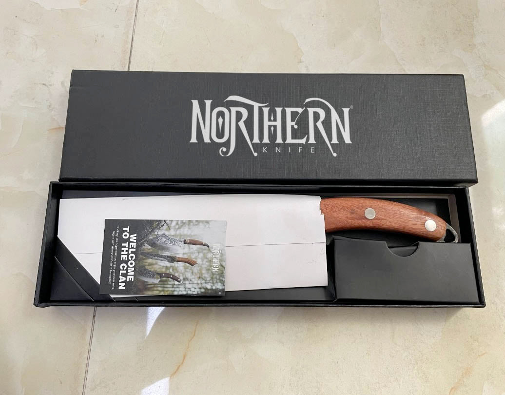 Ich entschied mich für das Set mit dem Metzgermesser, und es ist außergewöhnlich. Die Veredelungen sind bemerkenswert, und das Design ist atemberaubend. Ich bin besonders begeistert vom Fingerloch im Wikinger-Messer; es trägt erheblich zur Präzision bei. Und was das Metzgermesser betrifft, es ist robust, solide und ultrascharf.